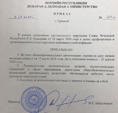 Приказ МОиН ЧР о переносе весенних каникул, в связи с профилактикой предотвращения короновирусной инфекции.