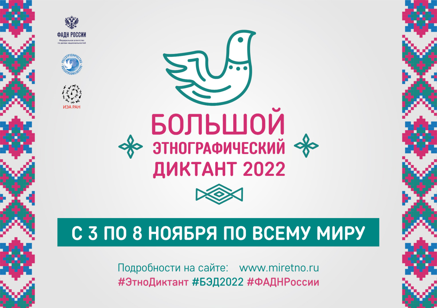 В 2022 году Большой этнографический диктант пишут онлайн с 3 по 8 ноября на официальном сайте акции miretno.ru.