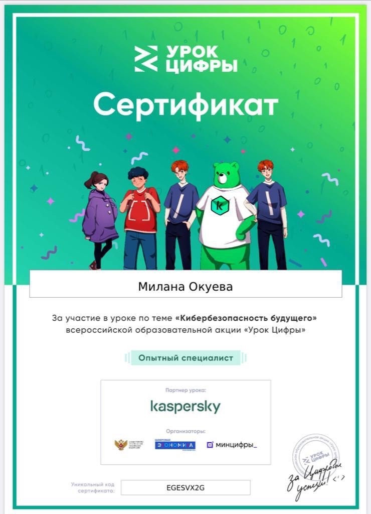 30.01.2024В МБОУ «СОШ с. Итум-Кали-Кали им. Исаева Х.А.» прошел Урок цифры», который посвящен теме «Кибербезопасность будущего». Урок адресован учащимся 1–11 классов и направлен на развитие ключевых компетенций цифровой экономики у школьников.Школьники узнали как обезопасить умный дом, защищать данные на смартфонах и противостоять самым разным кибератакам, в том числе тем, что реализуются с использованием продвинутых технологий. А ещё познакомились с многообразием профессий в ИТ и специалистами, которые уже сегодня разрабатывают подходы и решения для защиты различных устройств, чтобы сделать современный цифровой мир безопаснее.После выполнения всех заданий тренажеров все участники получили сертификаты. Ученики остались довольны.Принять участие в «Уроке цифры» можно как в школе, так и дома по ссылке https://урокцифры.рф/lessons/clouds-and-ai/ Задания делятся на три уровня сложности: для младших, средних и старших классов