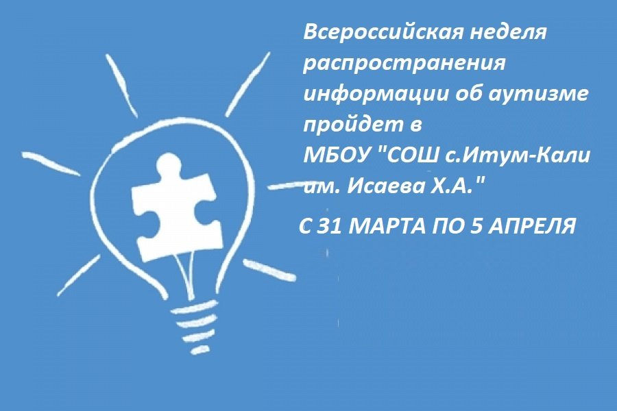 13.03.2024В МБОУ "СОШ с. Итум-Кали им. Исаева Х.А." пройдет ация "Неделя расспространения информации об аутизме" с 31 марта по 5 апреля.