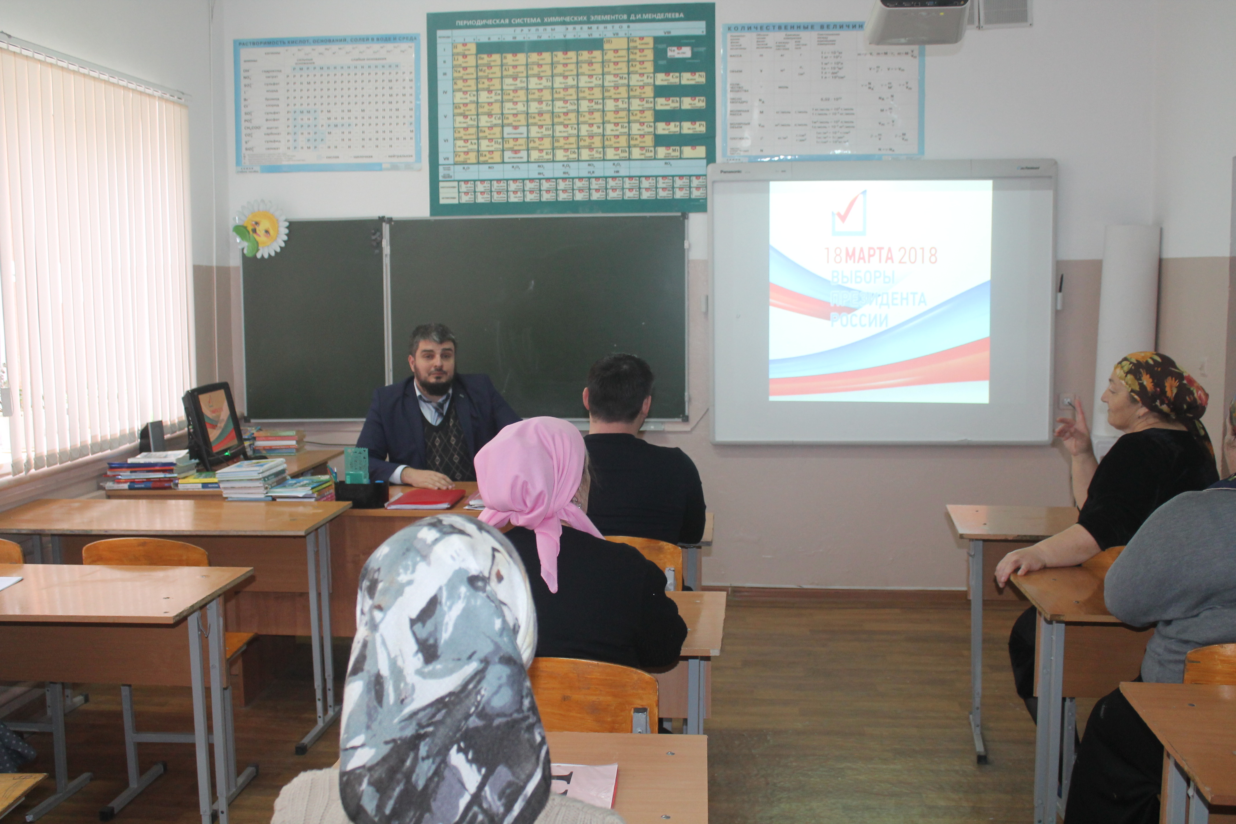 Во исполнение п. 9 протокольного поручения Главы Чеченской Республики, Героя России Р.А. Кадырова (совещание №01-12 от 22.02.2018г.) В МБОУ «СОШ с. Итум-Кали им. Исаева Х.А.» 05.03.2018 года было проведено мероприятие на тему важности участия в выборах. Директор школы Рабуев А.С. ознакомил коллектив школы с законодательством о выборах, подчеркнул насколько важно участие каждого гражданина в РФ в выборах Президента страны. В мероприятии приняли участие 28 человек.