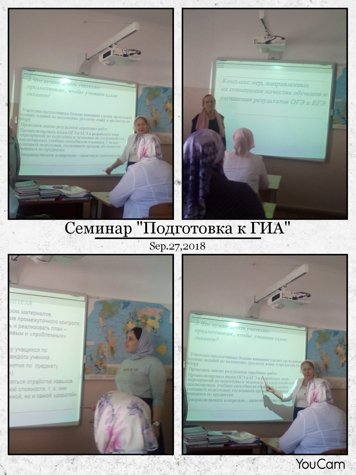 27.09.201827 сентября 2018 года в МБОУ "СОШ с.Итум-Кали им.Исаева Х.А." состоялся методический семинар по теме: "Подготовка к ГИА (из опыта работы учителя)", целью которого являлось обобщения и распространение передового педагогического опыта учителей при подготовке к государственной итоговой аттестации выпускников 9 и 11 классов.